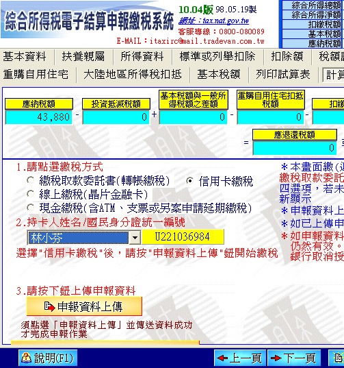 而選擇繳稅方式,包括有轉帳繳款、信用卡繳稅、晶片金融卡線上繳稅,以及現金繳稅等四種。轉帳或是信用卡繳稅,都必須是本人或配偶的帳戶或信用卡才行;使用晶片金融卡需扣10元的手續費;若是失業族符合延期繳稅者,就必須選擇現金繳稅的方式。最後再按「申報資料上傳」就完成申報了。