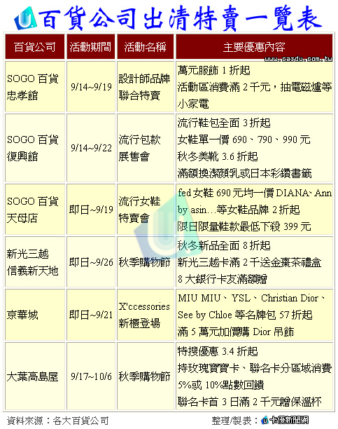時序進入9月中旬,百貨公司年度週年慶大檔開戰在即,各大業者發動最後出清特賣,無論是內衣、服飾,還是名牌包包,通通瘋狂下殺,包括設計師品牌服飾1折起、流行鞋包3折起,而秋冬新品同樣有3.4折起的誘人折扣,再加上滿額贈、抽獎等好康,都是女孩們不容錯過的「血拼」良機。