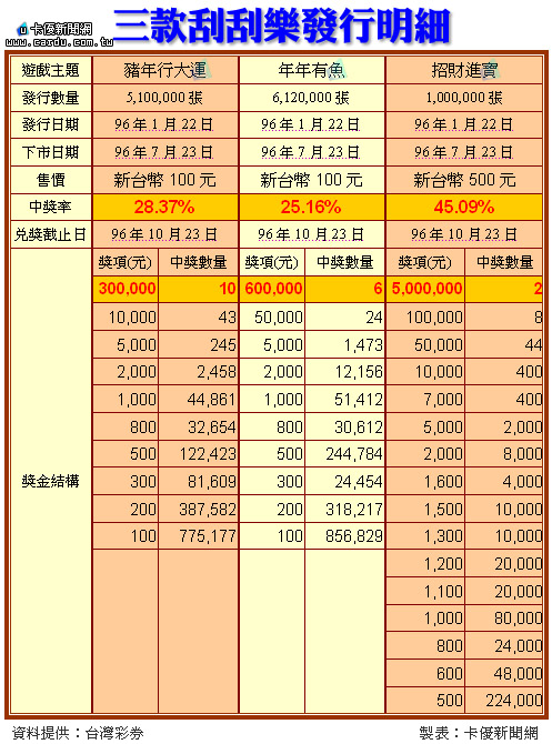 台灣彩券在過年前,推出了三款刮刮樂新產品–「豬年行大運」、「年年有魚」、「招財進寶」。其中「招財進寶」最高獎金高達500萬元,中獎率更接近5成(45.09%),換句話說就是買二張就會中一張,中獎機率創下公益彩券發行以來最高紀錄。