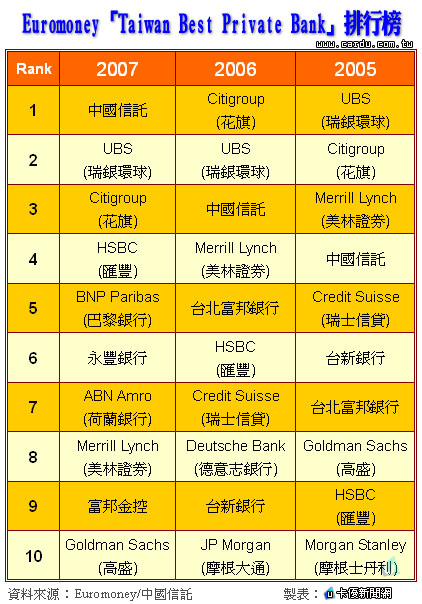 以高資產客群為目標的財富管理業務,過去通常都是外商銀行的天下,但是這幾年國內的金融業紛紛進入財富管理的市場,幾個大型銀行成績斐然,有相當不錯的表現。中國信託就連續三年獲得Euromoney(歐元)雜誌的肯定,被選為「台灣最佳本國財富管理銀行」,今年更擊敗外商銀行得到「2007年台灣最佳財富管理銀行」(2007 Taiwan Best Private Bank)殊榮。