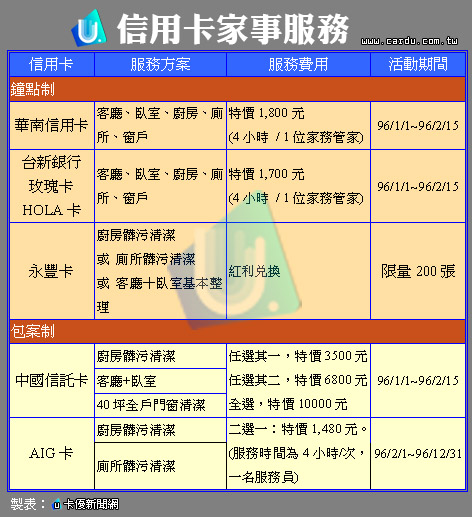 包案制則是採4小時2名或是8小時1名服務人員,來負責重點的掃除工作。例如中國信託卡、AIG卡都可選擇此種方案。其中中國信託有3種優惠方案可選擇,AIG則有體驗方案2選1,另有雙重88優惠,需要的民眾可依自己的需求來選擇。