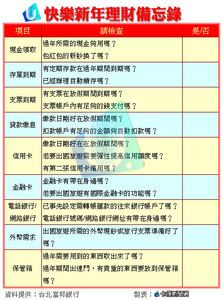 台北富邦銀行就貼心的提供了「快樂新年理財備忘錄」,列舉出過年前與金錢相關的檢查事項,民眾可以善加利用,讓年前繁雜的事務,整理出個頭緒。