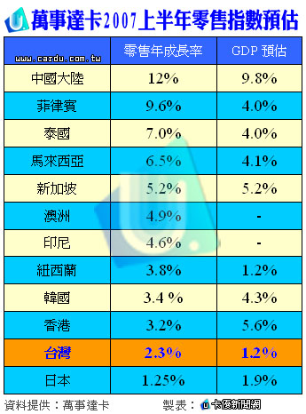 萬事達卡2月15日發布2007上半年最新的零售指數(MasterIndex™ of Retail),預測亞太區零售業將維持持續成長的趨勢。然而台灣成長率卻僅有2.3%,在亞太區12個調查市場中,排名為倒數第二位,而國民生產毛額(GDP)成長率更只有1.2%,居亞太之末。