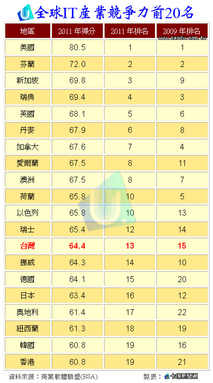 為了提供IT產業參考,英國「經濟學人」信息部第四度公布「2011年全球IT產業競爭力指數調查」,該報告針對全球66個國家的IT硬體、軟體與服務等面向,每2年進行1次評比,評估指標主要包括研發環境、IT基礎建設、法律環境、政府支援、人力資本與商業環境等6大項目。