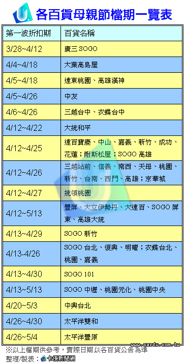 大環境景氣不佳,百貨業者叫苦連天,想盡各種促銷來吸引更多的人潮,以增加營業額。今年母親節5月13日將至,是百貨公司最主要的熱門促銷期間,無不絞盡腦汁,花招百出。已經有百貨公司迫不及待,提前開跑,推出第一波的折扣檔期,規模直逼週年慶。因此,消費者在大肆血拼前,可得先把功課做好才出手!