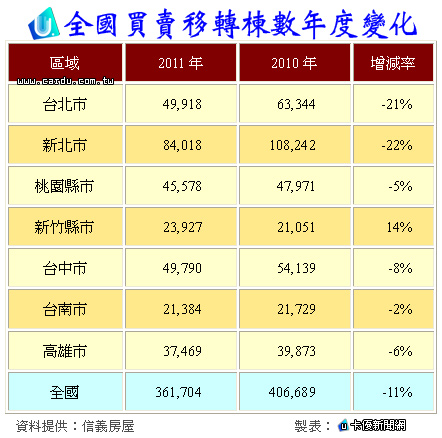 若進一步比較各縣市的全年表現,最好的是新竹地區,2011年比起2010年逆勢增加14%,桃園、台中、台南、高雄地區,買賣移轉棟數衰退幅度不到10%,表現都超越全國平均值,而投資風氣較盛的大台北地區,衰退幅度則在2成以上。