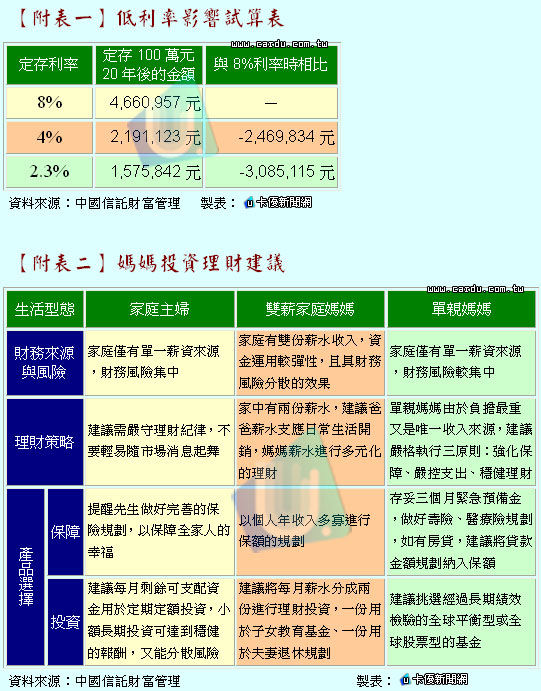 中國信託就建議「家庭主婦」,可以選擇「定期定額」的投資方式,不要進行衝動的投資行為,以保障全家人的幸福;至於,「雙薪家庭媽媽」可將理財投資的金額劃分成兩份,其中一份作為「子女教育基金」,另一份則是夫妻兩人的「退休基金」;而獨自承受家庭經濟重擔的「單親媽媽」,則應存妥三個月的緊急預備金,還要做好壽險及醫療險的規劃,慎選長期績效良好的全球平衡型或全球股票型基金,以降低投資風險,以「強化保障」、「嚴控支出」及「穩健投資」的為理財原則。(如:表二)