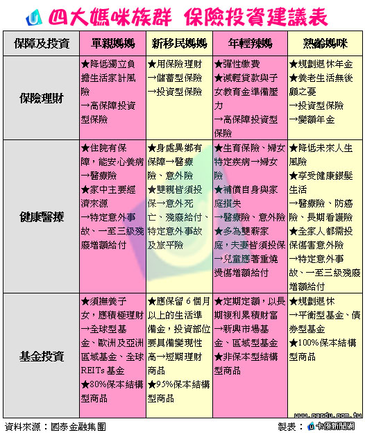 在現今的微利時代,媽媽持家不再侷限於保守被動的「勤儉持家」,「開源勝過節流」的觀念造就女性理財市場愈來愈興起,不同年齡層的媽媽們,單親媽媽、新移民媽媽、年輕辣媽或熟齡媽咪,面對投保保障與投資理財,各有不同需求。