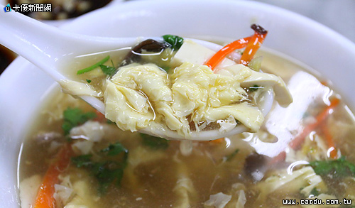 言歸正傳,說到酸辣湯,有人喜歡酸一點,也有朋友喜歡清淡爽口就好,身為很容易「眉頭一皺」的熊喵,是比較偏好清爽感的,這裡的酸辣湯就很合個人的口感,有點酸酸,但又不會過分,而且湯裡面的料倒是不少,滿滿的肉絲、木耳、蛋花、紅蘿蔔絲,誠意十足。