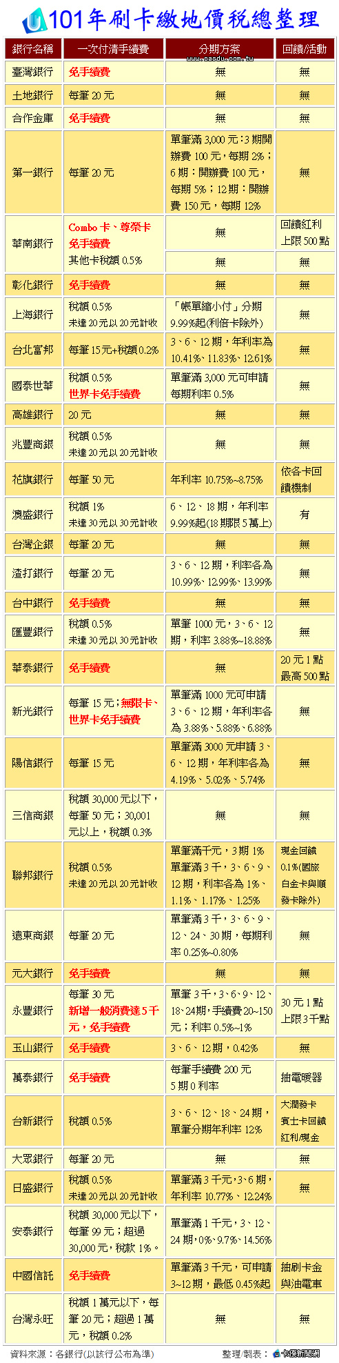 101年信用卡繳納地價稅總整理,如下表: