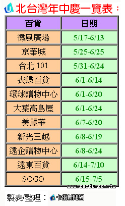 今年北台灣百貨業者,年中慶多在五月底至六月初開始,微風廣場於五月中時,就迫不及待的展開年中慶活動,打出夏季折扣七折,超市九折,部分鞋區更殺到三折。