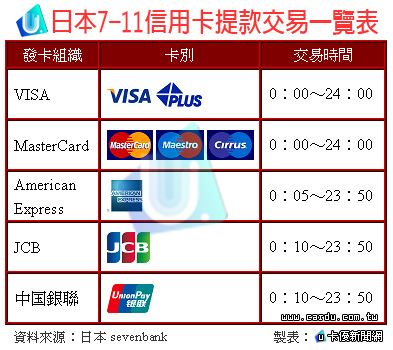各發卡組織使用SEVEN銀行ATM交易時間一覽表,如下: