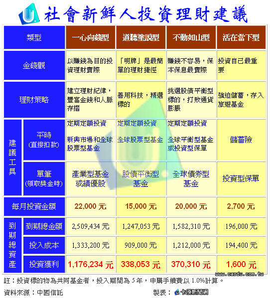 其中「一心向錢衝型」可能在學生時代對於股匯市、共同基金等工具已多有涉略,所以較具風險概念,也較勇於嘗試賺錢的方法,但卻容易沉溺在其中,不是大贏就是大輸。中國信託就建議,平時可選擇投資新興市場和全球股票型的共同基金。當有一大筆獎金時,再去選擇產業型基金或績優股做較積極的投資。