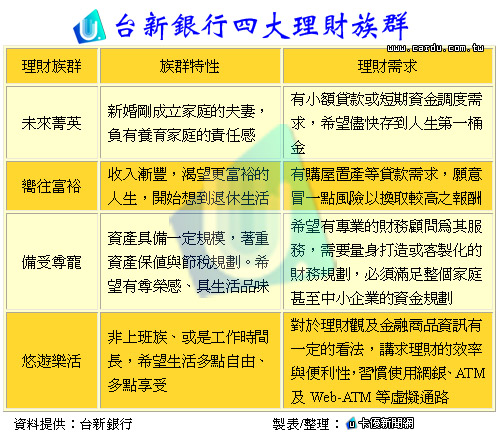 台新歸納出四大理財族群:「未來菁英」、「嚮往富裕」、「備受尊寵」、「悠遊樂活」,並表示下半年度,將針對不同族群的客戶,推出最適合的財管方案,以滿足不同生命週期客戶的理財需要。