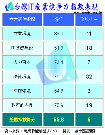 這份由商業軟體聯盟(BSA)贊助,針對64個國家之IT產業所做的評估報告,包含IT硬體、軟體和服務等部分。其中衡量指標共有六項,分別為「整體商業環境」、「IT基礎建設」、「人力資本」、「法律環境」、「研發環境」、及「對於IT產業發展的支援」。