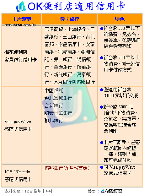 OK便利店所適用的信用卡,如下表: