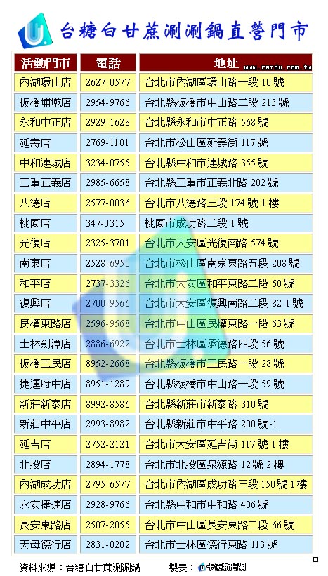 「台糖白甘蔗涮涮鍋直營門市」如下表: