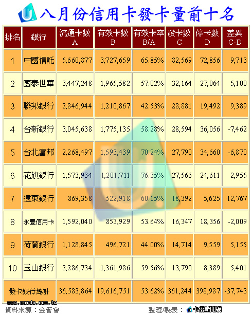 八月份信用卡發卡量前十名,請見下表: