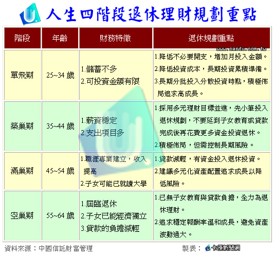 投資人不同的人生階段,為準備退休生活所面臨的挑戰也大不相同。中國信託表示,像25~34歲的民眾,屬於處在「單飛期」階段,對於投資理財策略應抱持勇於冒險的心態,可以多選擇股票型基金為投資標的。
