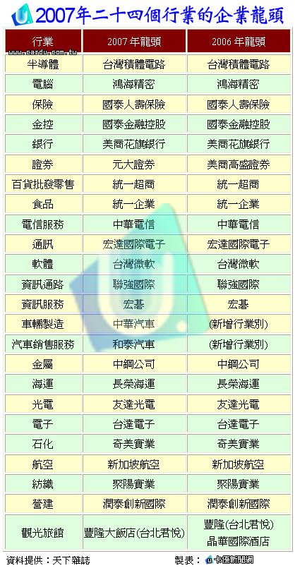 在二十四個行業的聲望調查中,也選出各行業的最佳龍頭,其中除了有半導體業的台積電、電腦業的鴻海之外,統一集團有兩大企業入榜,包括百貨及批發零售業的統一超商,以及食品業的統一企業。而國泰金控,也是金控業及保險業的龍頭,分別是國泰金控和國泰人壽;而銀行業是由花旗銀行獲得,證券業是元大證券。