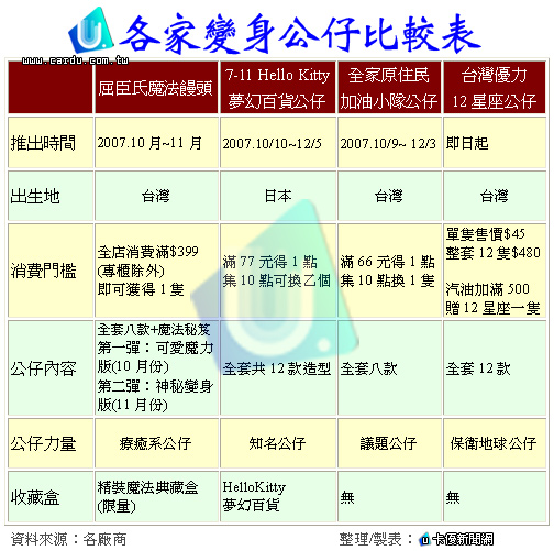台灣公仔市場戰鼓連連!從便利商店延燒到藥妝通路,現在連加油站也推出星座公仔,大家比創意、比出身、還要比收藏價值,屈臣氏魔法饅頭神秘變身;全家原住民加油小隊推出隱藏版;台灣優力加油站也推出第三代十二星座公仔。