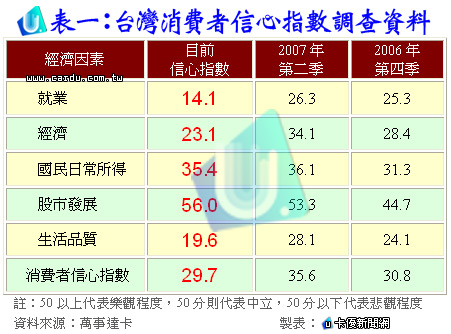萬事達卡公佈最新的消費者信心指數報告,這份針對亞太區市場的消費者,對於未來六個月經濟前景信心的調查,結果顯示亞太區消費者整體較六個月及一年前樂觀,但台灣卻是13個市場中消費者信心表現最為疲弱的市場,而且就業及生活品質的信心,更是亞太區市場中最低的地區。