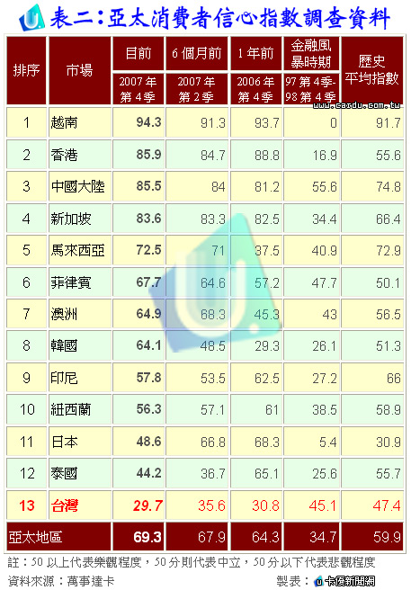 根據萬事達卡的調查顯示,亞太區消費者的樂觀情緒,並未受到次級房貸、油價上漲以及通貨膨脹所影響,大部份市場的消費者信心指數都持續看好。其中對經濟(68.3)、國民日常所得(81.0)、股市發展(66.5)及生活品質(66.7)的信心指數都有所上升;僅就業(63.8)一項維持不變。