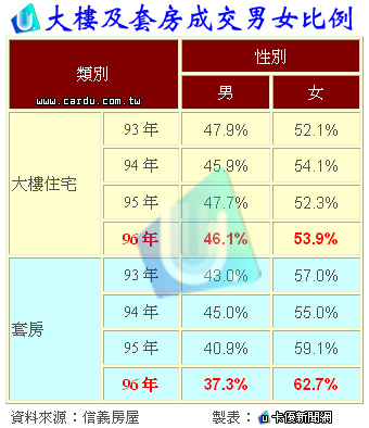 國內大樓及套房物件成交客戶男女比例,如下表: