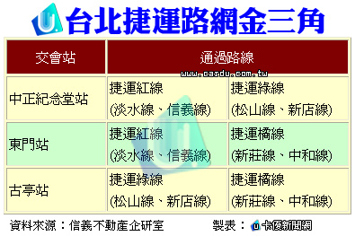 蘇啟榮進一步說明,翻開大台北的捷運路網圖可以發現,唯獨捷運中正紀念堂站、古亭站及興建中的東門站,恰好構成一個三角形轉運區間,各自擁有一條向外延伸的捷運路線,構成一個向外發散的大眾運輸路網,堪稱三條捷運路網交會的金三角。