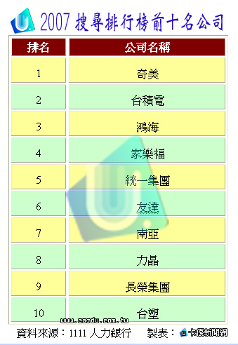 2007年搜尋前10名的企業,如下表: