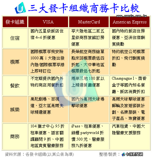 商旅中最重要的住宿訂房方面,Visa、MasterCard、American Express也分別不定期與各大飯店合作,提供商務人士優惠的住房價格。