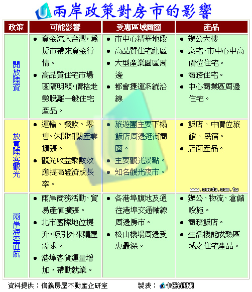2008年大選結果揭曉,在藍營狂勝221萬張選票之下,市場熱切期待馬英九選前承諾的兩岸開放政策,能夠如期兌現,以推升台灣產業的國際競爭力。房仲業者認為,藍營兩岸開放政策中的「陸資來台投資、開放觀光、三通直航」等,都將成為台灣房市邁入新世代的三項大動能,尤其選前受到台資回流以及通膨效應所激發的房市資金行情,可望在選後的樂觀氣氛下續航。