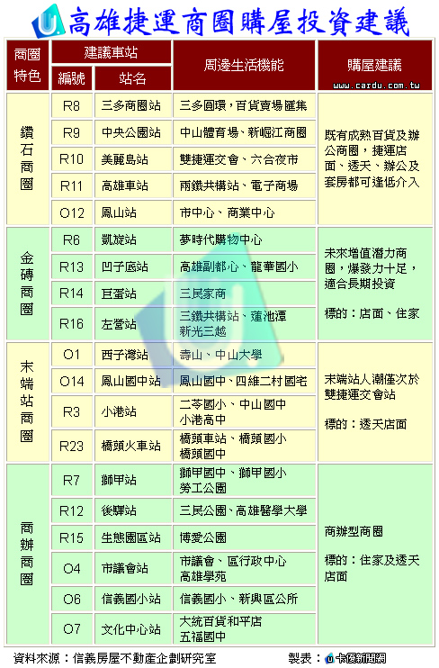 高雄捷運商圈購屋投資建議,如下表: