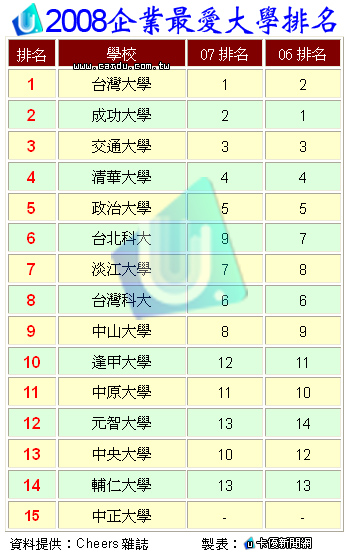 由《Cheers》雜誌連續12年執行的「台灣1000大企業人才策略與最愛大學生調查」結果出爐,台大蟬連冠軍,成大、交大位居二、三名。