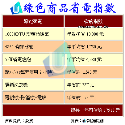 使用環保標章產品的省錢指數,如下表: