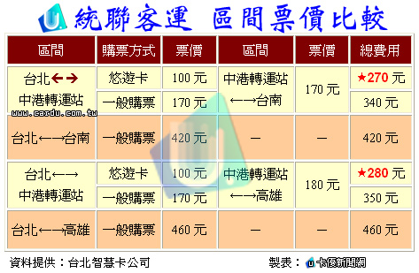 去年12月起統聯客運與台北智慧卡公司合作,可以使用悠遊卡搭車,還祭出票價135元的優惠,不但方便了台北的民眾,也使得許多台中的居民,開始使用悠遊卡,讓悠遊卡的版圖順利跨進中部地區。