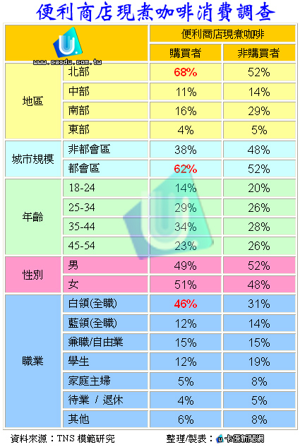 根據TNS模範研究的調查顯示,57%的台灣民眾有喝咖啡的習慣,而且過去一個月曾經喝過便利商店現煮咖啡的民眾,就約佔一成。能夠在短時間內達到10%的市場滲透率,顯見便利商店賣咖啡的實力不可小覷。