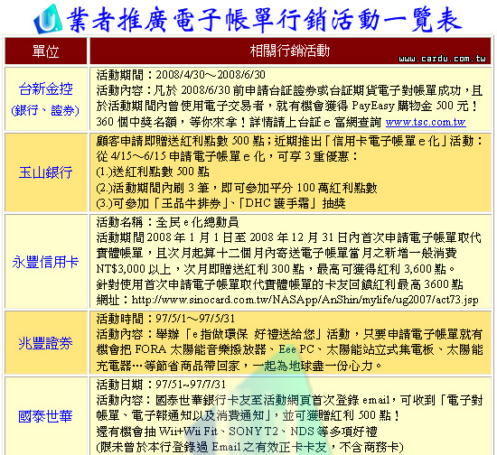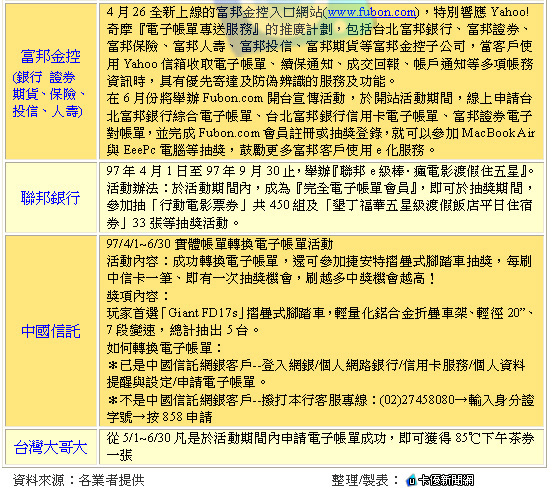 環保議題近期越來越夯,金融業者也藉由推動電子化帳單來響應,尤其4月30日更有八家重量級業者,與國內電子信箱龍頭Yahoo!奇摩合作,推出創新的「Yahoo!奇摩電子帳單專送服務」,讓台灣電子郵件業務進入掛號信時代。