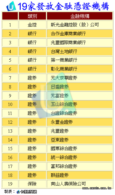 目前已發放金融憑證的金融機構共有十九家,包括1家金控、5家銀行、12加證券公司,以及1家保險公司。