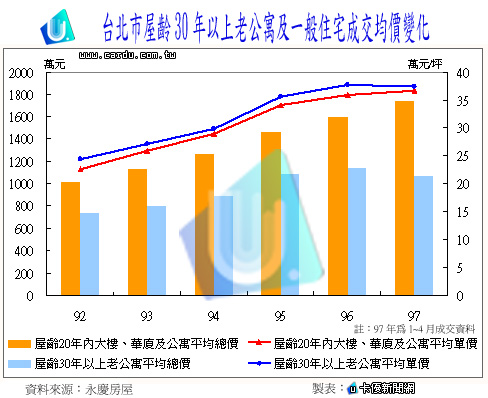 依據房仲業者統計,台北市屋齡30年以上的老公寓近幾年來的平均單價,比一般20年以內的住宅平均單價還高,從民國92年到現在,平均單價累積漲幅已達53%。