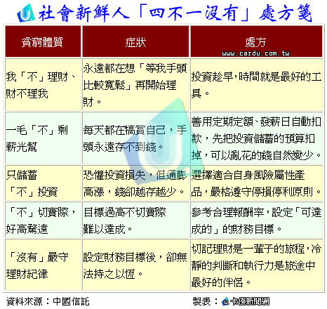 中國信託建議新鮮人可規劃自己的預算,利用小筆定期定額在每月發薪日時,自動扣款投入基金,不但分散進場時點而有降低風險效果,同時也養成強迫儲蓄習慣,等於幾乎擺脫「四不一沒有」的惡習,理財自然已經成功一半。