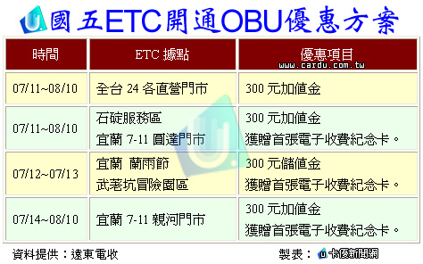 國道五號ETC開通,申裝OBU優惠方案,如下表: