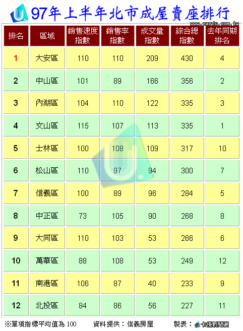 根據信義房屋公布的賣座排行榜中,今年上半年北市部份由大安區榮登賣座冠軍,亞軍則由中山區蟬聯,因內湖科學園區及捷運內湖線即將通車的加持,內湖區行情也看漲,順利上衝,與文山區並列第三。