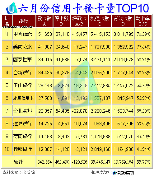 六月的總發卡量為342,564張卡,與五月相較增加了46,729卡,也比去年同期增加83,905卡。中國信託當月發卡站上5萬張(51,653),也重新奪回發卡王,美商花旗則以41,887的發卡量居次,打破了93年11月以來的紀錄。發卡第三至第五分別為,國泰世華(34,915張)、台新銀(34,435張)、玉山銀(28,143張)。