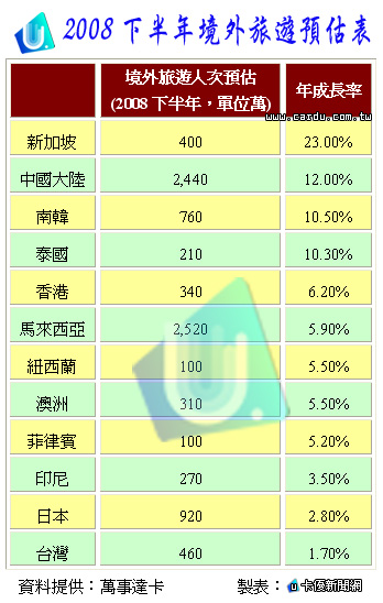 亞太地區2008下半年境外旅遊預估,如下表: