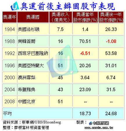 統計過去六屆奧運國在奧運年前後的股市表現,其中五屆的後奧運股市行情比奧運年更亮眼,亦即奧運後一年股市表現比奧運年為佳的機率高達83%,奧運後一年平均漲幅近25%也優於奧運年平均的19%。眼見中國股市今年跌幅超過五成,成為全球災難股市,卻增加了明年中國股市的想像空間。