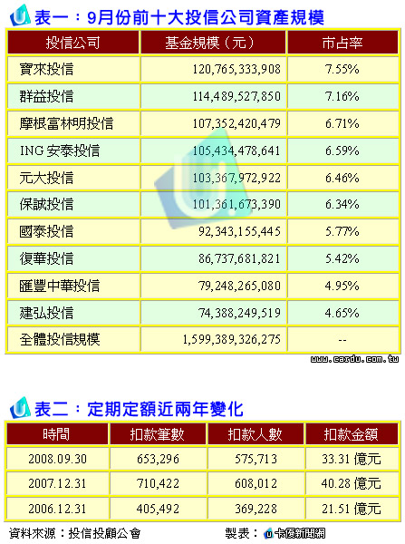 根據投信投顧公會資料顯示,9月份投信基金定期定額扣款金額為33.31億元,為去(2007)年6月底以來的新低,扣款人數連續第二個月減少到60萬以下。摩根富林明投信指出,9月份投信基金定期定額筆數及金額皆有減少,明顯受到市場波動影響,部份投資人開始停扣定期定額。