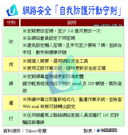 為了建全網路環境,國內網站龍頭Yahoo!奇摩今(30)日除了宣佈全面升級「網路安全中心」服務外,也率先與內政部警政署刑事警察局合作,推行「防護111網路安全日」的新觀念,將每月第一個星期一訂為「網路安全日」,希望大家一起來重視與宣導。