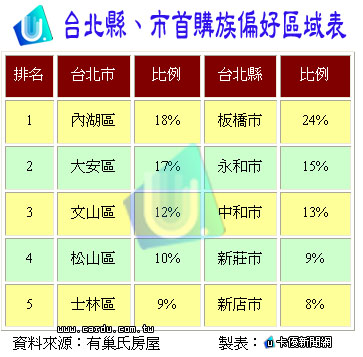 台北縣市首購族偏好地區,如下表: