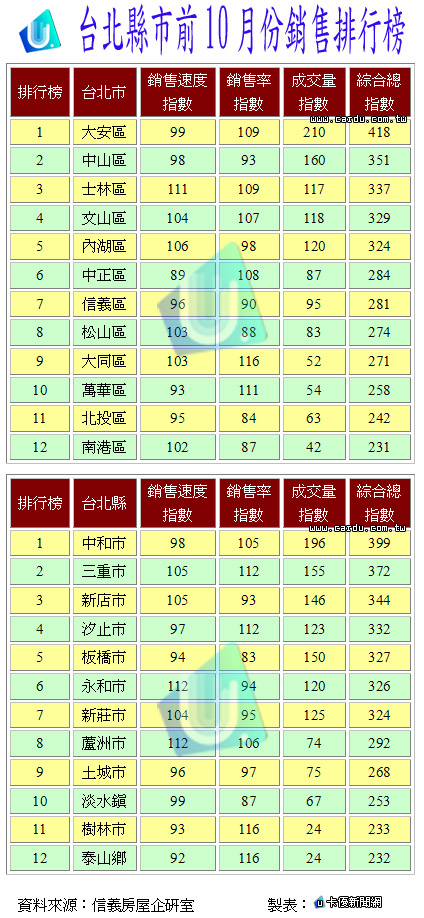 今(97)年房市大洗三溫暖,從年初的樂觀到選後轉為悲觀,尤其隨著投資客退場,目前已改由自住客為購屋主力。房仲業者統計,今年一月至十月房市賣座區域,台北市前三名為大安區、中山區與士林區;台北縣則以中和市、三重市與新店市較熱門。